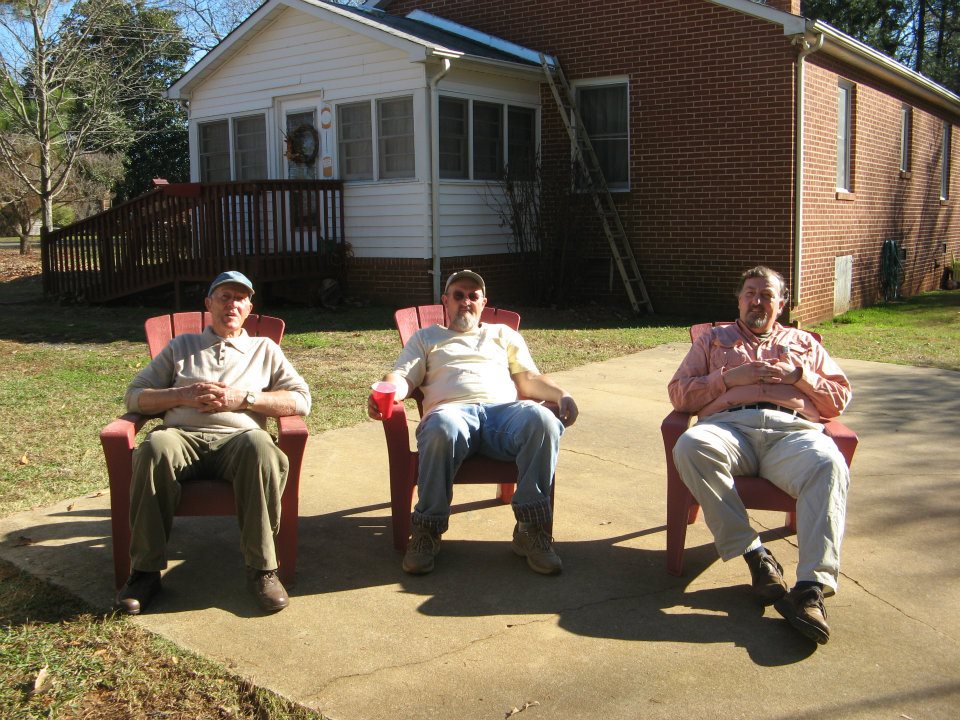 Looks like three men enjoying the sunlight (maybe after a filling meal?).
